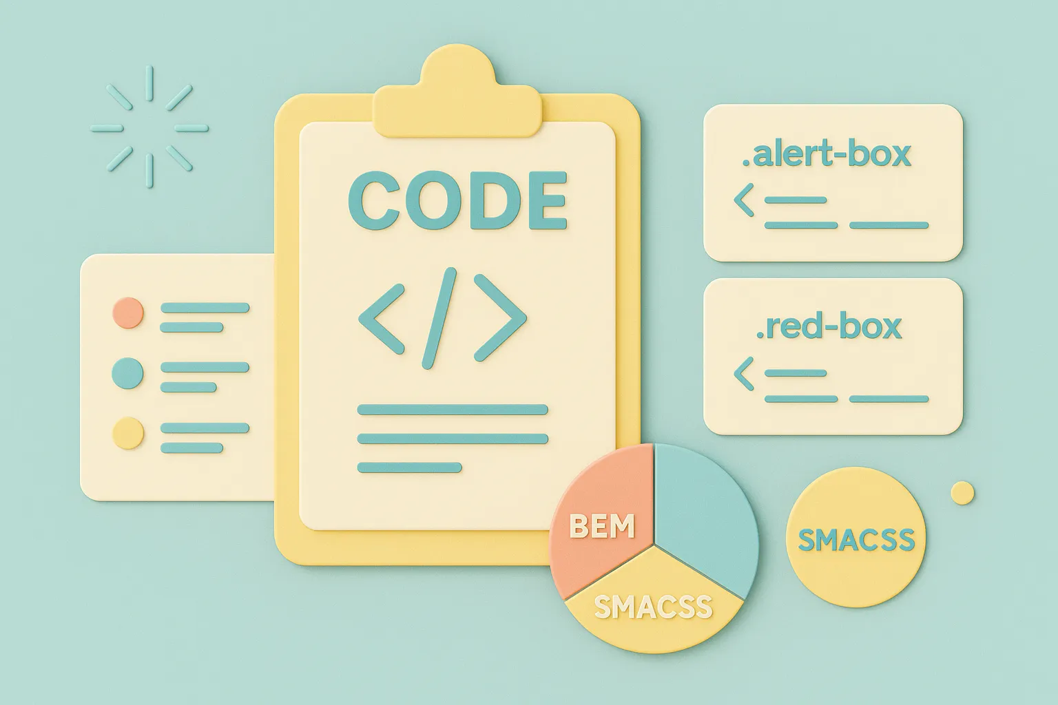 次に紹介したいのが、「構造」や「役割」を整理するためのルールです。ここで登場するのが BEM と SMACSS(スマックス)。この2つは、“クラス名の書き方”ではなく、CSS全体をどう整理するかという設計の考え方 です。